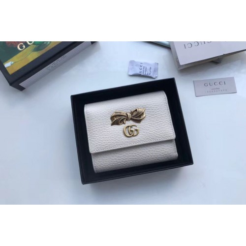 Metal studs in recognizable shapes, often inspired by the House’s romantic narrative, are displayed throughout ready-to-wear and accessories. Here, a delicate bow in antique gold-toned metal encrusted with sparkling crystals decorates the front of a white leather wallet. Pink trims enhance the accessory’s refined charm.