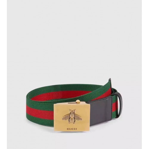 Signature Web canvas belt with a unfinished faded leather trim and our plaque buckle with embossed bee detail.Green/red/green cotton canvas Web with brown faded leather detailPlaque buckle with embossed bee detail1.5" widthAntique brass hardwareMade in Italy