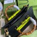 Combining recognizable elements of the House, the medium-sized tote bag is defined by its bamboo handles and Double G hardware. Crafted from smooth leather, the accessory is further accentuated by two neon bands, a playful reference to the bands used to keep handles in shape.