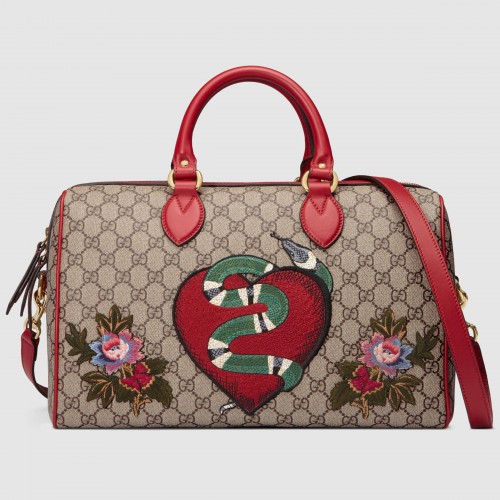 A special limited edition boston bag, featuring red leather trims and embroideries on GG Supreme. The appliqués feature a Kingsnake and heart and flowers embroideries.
