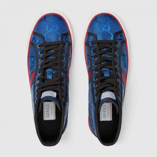 Part of the Gucci Tennis 1977 line, the high-top sneaker is introduced in blue rengerated nylon. Gucci Off The Grid is the first collection from Gucci Circular Lines—a concept created to support the House's vision for circular production. Designed for those mindful of their environmental impact, Gucci Off The Grid uses recycled, organic, bio-based and sustainably sourced materials. Regenerated nylon, crafted using recycled sewing thread and trims displays the GG pattern.