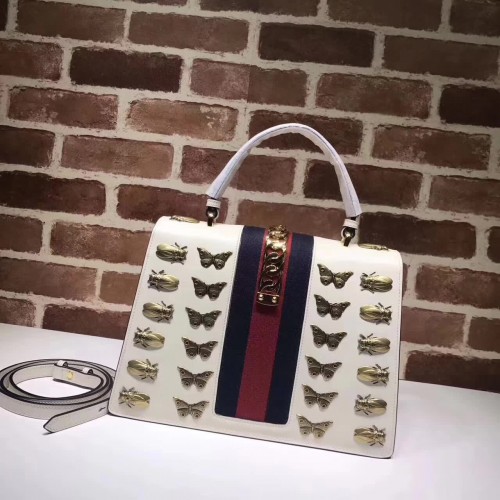 Gucci Sylvie Metal Animal Insects Studs Leather Top Handle Medium Bag 431665 White 2017