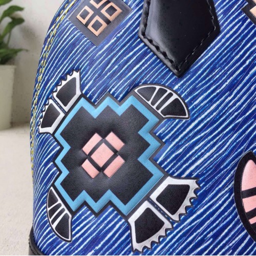 LOUIS VUITTON ALMA BB EPI LEATHER BLUE M50833SKU:a2411899800Size:25cmIt was a stand-out signature of the F/W 15 runway: Epi Azteque leather, made of Epi denim, introduced with the SS15 show and enriched with a stone washed white color, tattooed with joyfull ethnic motifs. Applied to the Alma, an iconic House shape, the result is a must-have bag that combines Vuitton heritage with Nicolas Ghesquière’s experimental attitude. It may also be one of the season’s most versatile pieces. The color story complements all manner of looks, and the sweet BB size can be carried in so many ways – by hand, over the arm, on the shoulder or cross-body.- Epi leather- Removable leather strap- Textile lining- Silver color metallic pieces- Double-zip closure with padlock and keybell- Riveted handles- Double smartphone inside pocket