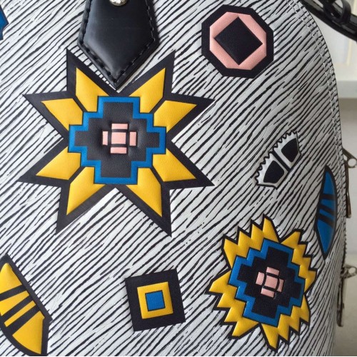 LOUIS VUITTON ALMA PM EPI LEATHER BLANC GRIS SKU: a2411-010SIZE: 32 CM- Epi leather- Removable leather strap- Textile lining- Silver color metallic pieces- Double-zip closure with padlock and keybell- Riveted handles- Double smartphone inside pocketIt was a stand-out signature of the F/W 15 runway: Epi Azteque leather, made of Epi denim, introduced with the SS15 show and enriched with a stone washed white color, tattooed with joyfull ethnic motifs. Applied to the Alma, an iconic House shape, the result is a must-have bag that combines Vuitton heritage with Nicolas Ghesquière’s experimental attitude. It may also be one of the season’s most versatile pieces. The color story complements all manner of looks, and the sweet BB size can be carried in so many ways – by hand, over the arm, on the shoulder or cross-body.